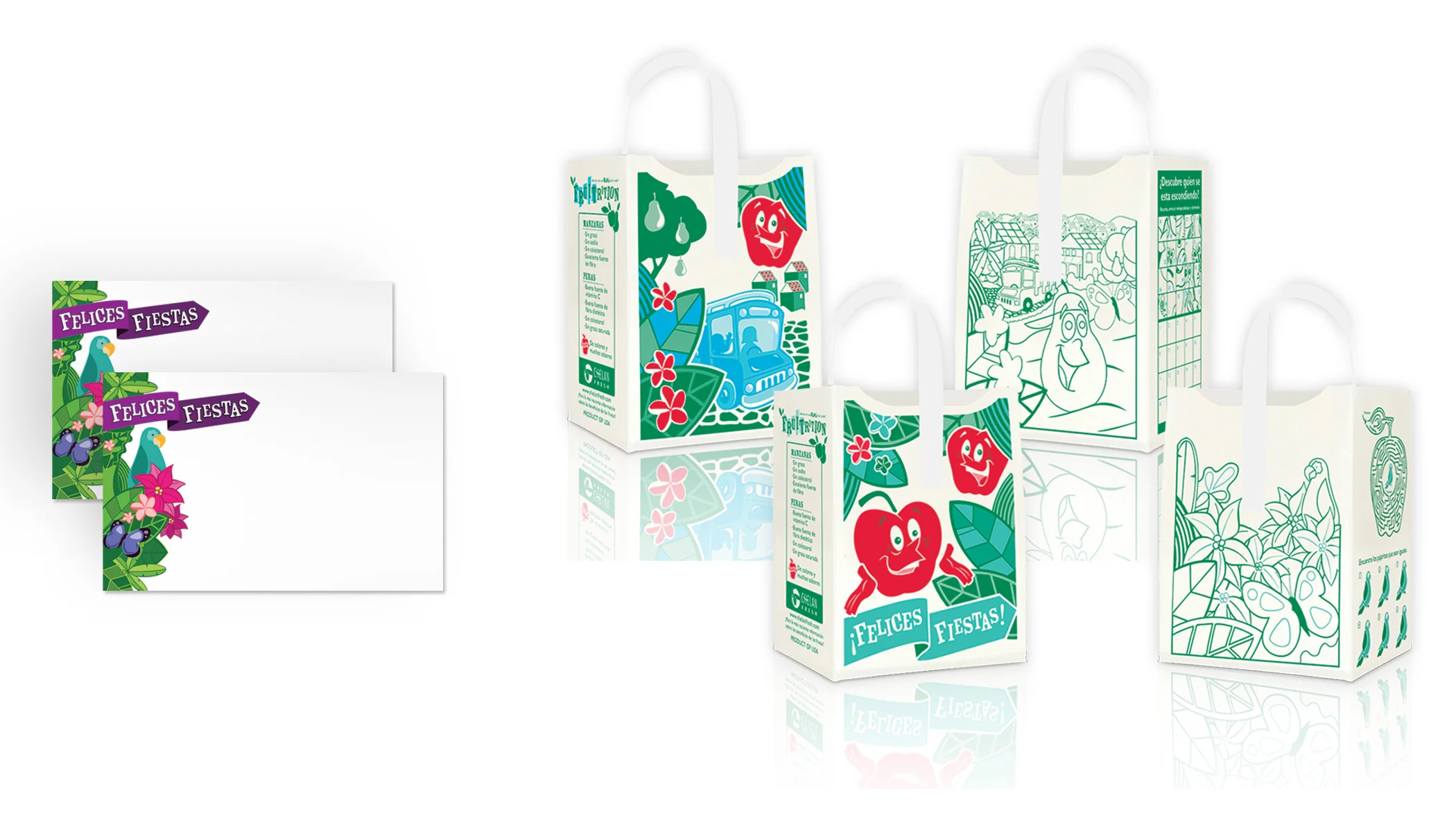 Four box bin, apple totes showing English and Spanish versions, and P.O.S. cards